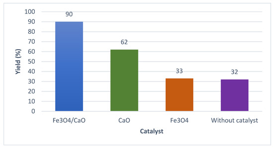 The biodiesel yield produced from palm oil off-grade catalyzed by Fe3O4/CaO, CaO, Fe3O4, and without catalyst.