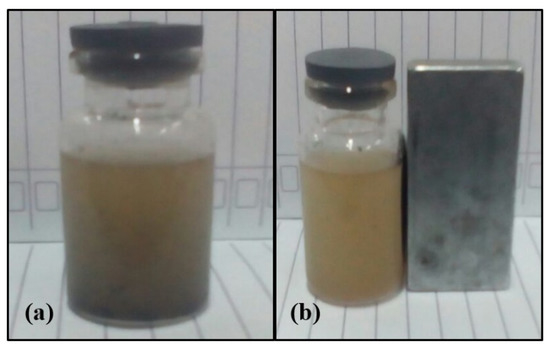 The obtained biodiesel produced from palm oil off-grade: (a) still contained the Fe3O4/CaO catalyst; (b) after being separated from the Fe3O4/CaO catalyst.