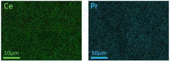 EDX maps of the Ce50Pr50 catalyst showing the distribution of Ce and Pr ions.