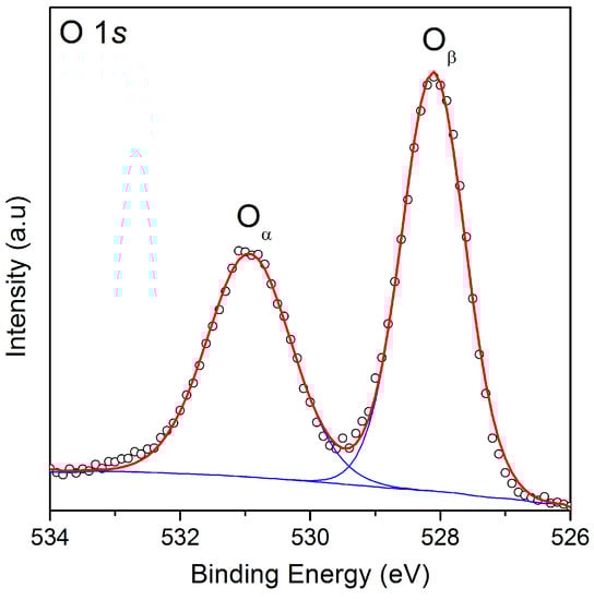 The oxygen species on the surface of the sample were investigated analysing the O 1s XP spectrum shown in Figure 4, in which two distinct peaks can be observed. The intense peak centered at 528.1 eV can be ascribed to lattice oxygen (the so-called “Oβ”) [29,30] and it is slightly shifted towards lower binding energy as a consequence of Pr addition [25]. The peak at higher binding energy (530.9 eV) is instead assigned to the various “Oα” capping oxygen species chemisorbed on the surface, e.g., hydroxyl (OH−), carbonate (CO32−), peroxide (O22−) or superoxide (O2−) ions [31,32]. The relative abundancy of the Oα species, calculated from the area of the deconvoluted peaks and reported in Table 1, proved to be significant. A high quantity of chemisorbed oxygen can foster oxygen mobility and spillover at the catalyst surface, with beneficial effects during the oxidation reactions [13]; in particular, reactive oxygen species play a key role in the soot oxidation, in which a direct interaction between the two solid phases is limited by the few contact points.