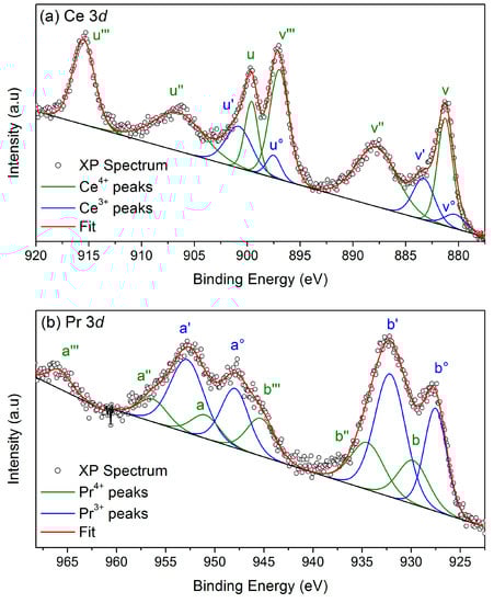 Figure 5a depicts the Ce 3d core level region of the XP spectrum. Five “u” and five “v” peaks were identified, related to 3d5/2 and 3d3/2 states, respectively. The v°, v’, u° and u’ peaks were ascribed to Ce3+ ions, while the other six peaks were assigned to the 4+ oxidation state [33,34]. A similar deconvolution was performed on the Pr 3d XP spectrum, in the 968–923 eV region (Figure 5b), ascribing four peaks (herein denoted as a°, a’, b° and b’) to Pr3+ ions and other six peaks to the 4+ oxidation state [35]. The relative abundancy of the Ce and Pr cations was estimated after the deconvolution, and the calculated values are resumed in Table 1. Although Pr addition was proved to increase the Ce3+ quantity [25,36], cerium maintains 4+ as primary valence. Instead, most of the Pr cations are in the lower oxidation states, confirming the higher reducibility of this element and suggesting a strong presence of oxygen vacancies at the catalyst surface.