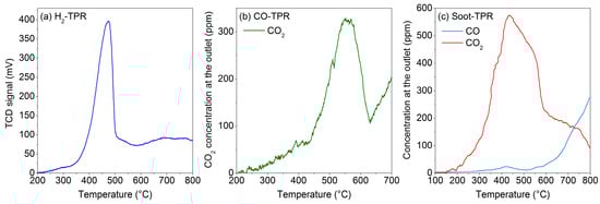 Results of the temperature programmed reduction analyses performed on the Ce50Pr50 catalyst: (a) H2-TPR, (b) CO-TPR and (c) Soot-TPR.