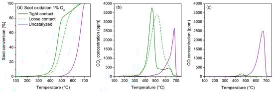 Afterwards, the activity of Ce50Pr50 towards the oxidation of particulate matter was evaluated. This heterogeneous reaction involves two solid phases, and is therefore strongly dependent on the quality of the contact at the interface, i.e., the force with which the two solids are brought together and the compatibility of their surface features [12,51,52,53,54]. For this reason, the catalytic activity was probed in two different conditions: loose contact (LC), which is more representative of the real situation in a GPF, was achieved by gently mixing the two powders with a spatula, while tight contact (TC), which can provide further information about the intrinsic activity, was reached via ball milling. Synthetic Printex-U carbon black was used as carbonaceous particulate, since it represents a suitable substitute for GDI soot [55], and 1% of O2 was fed to the reactor.