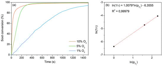 Soot conversion profiles as a function of time during the isothermal soot oxidation tests performed over the Ce50Pr50 catalyst in different O2 conditions (a). Linear regression of the experimental data (b), as described in Equation (6).