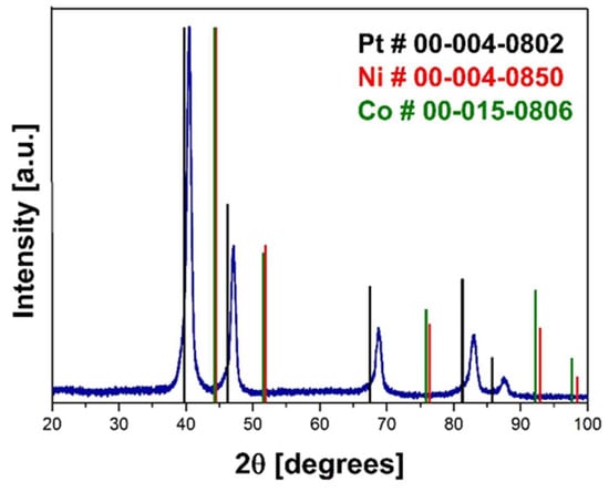 The powder XRD pattern of the as-synthesized Pt2NiCo nanocatalyst is presented in Figure 1 after removing the background and compared with the Bragg reflections of Pt face-centered cubic (FCC; black marks), Ni FCC (red marks), and Co FCC (green marks). The diffraction peak positions of the trimetallic Pt2NiCo nanoparticles show a shift to a higher 2θ as compared with metallic Pt, with the value for the Pt (111) peak in the reference located at 39.76°, whereas the experimental peak is at 40.47° (0.71° higher). Moreover, the peak positions of the Pt2NiCo catalyst are located between elemental Pt, Ni, and Co. As previously reported, the significant shift to higher 2θ values relative to those of pure Pt is attributed to the formation of a Pt2NiCo trimetallic system []. Because the Pt2NiCo catalyst did not present superlattice peak positions similar to those reported by Lokanathan et al. [], we inferred that the synthesized catalyst is not a face-centered tetragonal structure. Otherwise, the experimental findings obtained here are similar to those reported with an FCC structure [,]. The crystallite size was calculated using Topas Software [] and considering an analysis of all the peaks of the diffractogram using a fundamental parameters approach for profile fitting. An average value for the crystallite size (11.25 nm) was obtained, with a weighted residual error of 5.917 and the goodness of fit at 2.17, thereby confirming a good fit of the model with the experimental data.