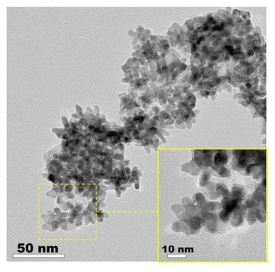 Low-magnification scanning transmission electron microscopy (STEM) micrograph of an agglomerate of Pt2NiCo nanoparticles. The inset corresponds to a magnified view of the framed zone (dashed line).