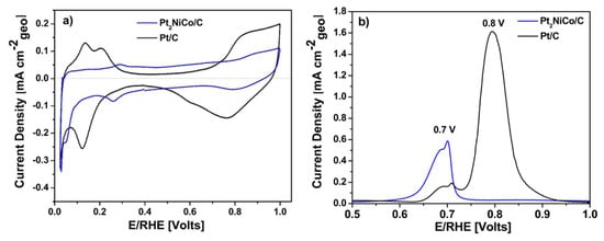 Catalytic inks were fabricated for the Pt2NiCo/C and Pt/C (Pt/C Etek® 20 wt.%) catalysts according to a previously reported protocol [] and deposited on a glassy carbon disk electrode (0.196 cm2) with Pt loadings of 20 ± 2 μgPtcmgeo−2. Electrochemical experiments were performed at room temperature (25 ± 2 °C) in a three-electrode electrochemical cell using a 0.1 M HClO4 solution as electrolyte. An Autolab PGSTAT302N potentiostat/galvanostat (Metrohm Autolab B.V., Utrecht, Utrecht, The Netherlands) was used for the electrochemical procedures. A platinum mesh and a reversible hydrogen electrode (RHE) were employed as the counter electrode and reference electrode, respectively. The catalytic activities of Pt2NiCo/C and Pt/C were investigated using cyclic voltammetry (CV), CO-stripping, and a rotating disk electrode (RDE). The description of these procedures was reported previously [].