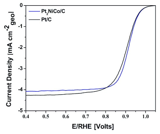 Potentiodynamic polarization curves of the Pt2NiCo/C and Pt/C catalysts measured at 1600 rpm with a scan-rate of 20 mV s−1.
