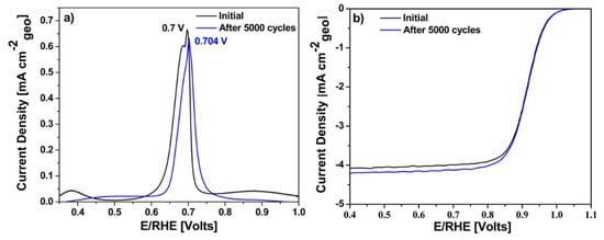 As previously discussed, the synthesized Pt2NiCo/C catalyst can be considered a better candidate for ORR than the commercial Pt/C in acid medium; however, to better understand the electrocatalytic performance, we developed stability tests. To this end, the Pt2NiCo/C and Pt/C nanocatalysts were subjected to a detailed stability test involving 5000 cycles of CV from 0.60 V to 1.0 V/RHE. The CO-stripping and RDE were used to determine the electrochemical performance after the 5000 cycles of CV. The CO electrooxidation peaks for the Pt2NiCo/C (Figure 7a) and Pt/C nanocatalysts before and after stability testing did not change significantly. This suggested that the synthesized material maintained its ECSA, which can be attributed to the high stability of the supported trimetallic Pt2NiCo nanoparticles, whereas results for the commercial Pt/C showed a loss of ~10% of its ECSA (Figure 8a). The initial potentiodynamic curves for synthesized Pt2NiCo/C before and after 5000 potential cycles of CV are shown in Figure 7b. It is important to note that an outstanding result of this study is the high stability of the synthesized catalyst, given that there is no loss of activity after the 5000 cycles of CV. For Pt/C, the potentiodynamic curve shifted to higher overpotentials (Figure S2), suggesting that the Pt2NiCo/C catalyst is more stable than Pt/C toward the ORR in acid medium. Figure 8 shows the average values of SA and MA for the Pt2NiCo/C and Pt/C nanocatalysts, revealing increases in both for the Pt2NiCo/C nanocatalyst after the 5000 CV cycles. This increase in catalytic activity can be associated with the cleaning (removal of the surfactant mixture) of the catalyst surface by application of the 5000 CV cycles to the Pt2NiCo nanoparticles [] and to the electronic structure modification of the Pt2NiCo nanoparticles (Figure 4) [,]. The Pt/C nanocatalyst showed no significant change in SA after the 5000 CV cycles, whereas the MA decreased by ~20% (Figure 8c). Furthermore, the MA of the Pt2NiCo/C nanoparticles after the 5000 CV cycles (0.57 A mg−1Pt) is similar to that reported previously for PtFeCo/C after 10,000 CV cycles (0.55A mg−1Pt) [].