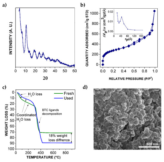Fe-BTC physical characterization: (a) X-ray diffraction (XRD) pattern; (b) adsorption isotherm of N2, inset: micropore size distribution by BHJ method; (c) thermogravimetric analysis (TGA) curves before (fresh) and after reaction (used); (d) SEM micrograph of Fe-BTC powder.