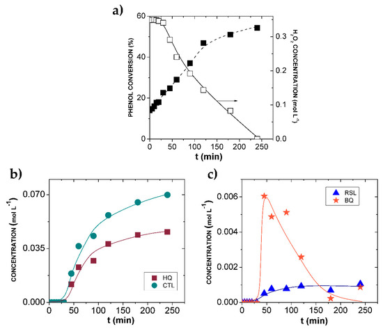 As can be seen, there is an induction period that, at the particular operating conditions of Figure 3 (T = 20 °C, W = 0.01 g and 1:1 molar), is equivalent to 25 min. During this time, the phenol uptake is due to its adsorption on the Fe-BTC surface (around 20% of the initial concentration), while H2O2 is not decomposed and oxidation products are not detected. The same phenol uptake was obtained in a control experiment carried out at the same operating conditions but in the absence of the oxidant. After this lapse, in which the catalyst has been saturated in phenol, the decomposition of H2O2 into HO• species began and the concentration of both CTL and HQ started to increase. RSL and BQ were also detected, but their concentration was one order of magnitude lower than CTL and HQ. Notably, the maximum in the BQ concentration profile was achieved at around 50 min of reaction. According to this, DHBZ are the final products, whereas BQ is an intermediate component, and it can further react to more complex molecules, such as unwanted tar products [25,34].