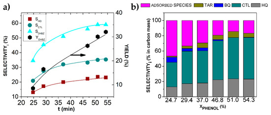 To gain an insight into the products’ distribution, the TOC of the reactor liquid samples was also analyzed and the results were compared to the calculated TOC values from the identified components (phenol, CTL, HQ, BQ and RSL). The differences were attributed to the sum of the unidentified carbon present in the liquid phase and other more complex species, such as tar. The difference between the initial TOC (corresponding to phenol concentration of 0.35 mol L−1) and the measured TOC in the liquid sample provides the amount of carbon adsorbed on the Fe-BTC surface. Overall, the selectivity distribution in terms of carbon mass is shown in Figure 4b. The progressive production of tar is clearly observed, while BQ disappears. The tar selectivity ranged from 1 to 7% in carbon mass. The initial amount of adsorbed species is as much as 50% and is reduced by up to 17% upon reaction. Initially, the adsorbed species were mainly phenol, that is progressively hydroxylated to CTL, and HQ (Figure 4b). At the end of the reaction (phenol conversion of 54% and total consumption of H2O2), the adsorbed phenol seems to evolve into more complex molecules, also postulated as the tar component, according to the broad peak detected by DSC-TGA (Figure S1). Upon reaction, CTL and HQ became the major components, and 70% of the phenol initial carbon was finally converted into them.