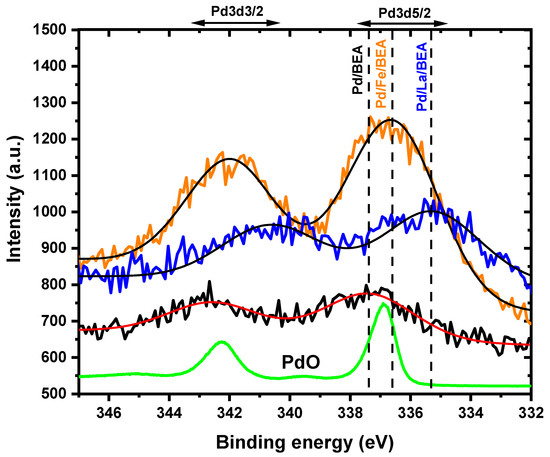 In order to evaluate the oxidation state of Pd in the Pd/BEA, Pd/Fe/BEA, and Pd/La/BEA samples, X-ray photoelectron spectroscopy was used. The instrument used for the measurements was a PHI 5500 Multi-Techniques ESCA system with monochromated Al X-ray (E = 1486.6 eV) as the X-ray source. To compensate for charging effects, the spectra were aligned with the position of the Si 2p peak located at 103.6 and the Al 2p peak located at 74.8 eV, which corresponds to SiO2 and Al2O3 present in the zeolite beta structure, respectively. Limitation of the measurements is for low atomic percentages in samples. For these samples, the Pd content is lower than 1 atomic percentage, which gives a level of uncertainty to the results.