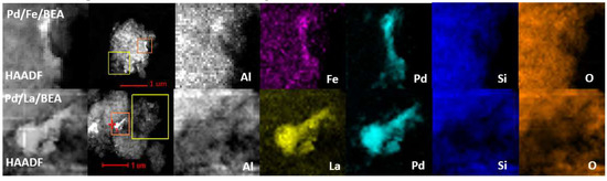 Scanning transmission electron microscopy energy-dispersive X-ray (STEM-EDX) analysis was performed on freshly calcined powder samples of Pd/Fe/BEA and Pd/La/BEA. The results are shown in Figure 3. Images were collected over areas containing agglomerates of Pd. The first row contains images from Pd/Fe/BEA, and the second row from Pd/La/BEA. Silicon, aluminum, and oxygen are evenly distributed and follow a similar pattern. This was expected since these elements originate from the zeolite framework structure. Iron was detected in connection to Pd for Pd/Fe/BEA; however, iron was also detected in other locations. It can be seen in the figure that La and Pd are located closer to each other than Fe and Pd. It is important to note that for zeolites functionalized using incipient wetness impregnation, most Pd, Fe, and La are likely present inside the porous zeolite structure. However, STEM-EDX accessed mainly particles on the outside of the zeolite crystals with the resolution of the STEM-EDX in the figure due to the size-limitation on particles in the porous structure of the zeolite. However, the results from the STEM-EDX analysis nicely correlate with the results from the TPO measurements (Figure 1), where both La and Fe were found to influence the oxidation temperature of Pd, thus indicating a clear interaction with Fe/La and Pd.
