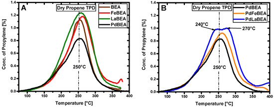 Temperature-programmed desorption (TPD) of propene was performed in dry conditions to evaluate the adsorption and desorption of smaller hydrocarbons. The results are shown in Figure 4. Panel A contains the desorption profiles for BEA, Fe/BEA, La/BEA, and Pd/BEA, and Panel B contains the profiles from the samples where Pd and Fe, or La together with Pd are present (Pd/BEA, Pd/Fe/BEA and Pd/La/BEA). The results show that the desorption maximum of propene is primarily located around 250 °C for all samples, including the BEA reference sample. This indicates that the desorption of propene in this temperature range can be associated with desorption from the zeolite BEA, i.e., the Brønstedt acid sites [5,17]. The high storage capacity of propene in Figure 4 can be explained by the low SiO2/Al2O3 ratio of the zeolite used in the present study, which is consistent with previous studies [17,18,25]. Furthermore, the XPS results (see Figure 2) show that the oxidation state of Pd becomes lower when introducing Fe and especially La. The same trend is found for the propene TPD, where Pd/Fe/BEA, and especially Pd/La/BEA, desorb higher amounts of propene, indicating that a lower oxidation state of Pd is beneficial for the storage of propene.