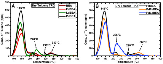 Temperature-programmed desorption of toluene in dry conditions where the concentration of toluene is plotted against the corresponding desorption temperature during the heating ramp for (A) BEA, Fe/BEA, La/BEA, and Pd/BEA; and for (B) Pd/BEA, Pd/Fe/BEA, and Pd/La/BEA.