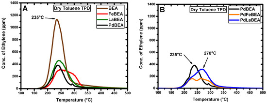 Temperature-programmed desorption of toluene in dry conditions where the concentration of formed ethene is plotted against the corresponding temperature for (A) BEA, Fe/BEA, La/BEA, and Pd/BEA; and (B) Pd/BEA, Pd/Fe/BEA, and Pd/La/BEA.