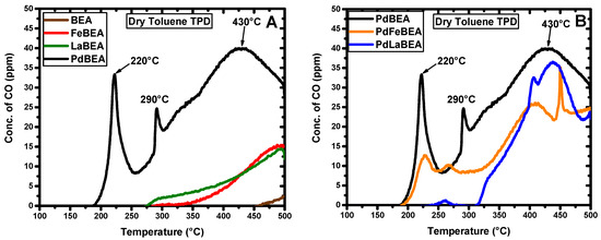 Temperature-programmed desorption of toluene in dry conditions where the concentration of formed CO is plotted against the corresponding temperature for (A) BEA, Fe/BEA, La/BEA, and Pd/BEA; and (B) Pd/BEA, Pd/Fe/BEA, and Pd/La/BEA.