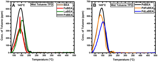 Since toluene is a major component of gasoline, it is highly relevant when studying HC-trap mechanisms. Toluene-TPD experiments were consequently performed. The results for toluene-TPD experiments performed in dry conditions are shown in Figure 5. For all samples, a large desorption peak ranging from 100 to 180 °C can be seen. This peak is attributed to storage of toluene in the zeolite [24]. In this temperature region, it can also be seen that the desorption of toluene is highest for Pd/BEA and lowest for Fe/BEA. The addition of La and Pd, in particular, clearly improves the storage capacity of toluene compared to the pure zeolite beta sample. These results contradict the results from the propene-TPD experiments, where the addition of Pd resulted in lower storage capacity of propene in dry conditions. We suggest that the reason for this difference is that the phenyl ring of toluene can also adsorb Lewis acid sites [10,11,12,18,19,20], such as Pd, while propene preferentially interacts with Brønsted acid sites through hydrogen bonding with the π electrons in the C=C bond [17]. Some desorption peaks also appear at higher temperatures in Figure 5. The BEA reference sample only desorbed minor amounts of toluene at higher temperatures, which was also found for Fe/BEA and Pd/BEA. Interestingly, the La/BEA sample has a desorption peak at 240 °C, which increases in the presence of Pd (see the Pd/La/BEA sample in Figure 5B), despite that the Pd/BEA sample exhibits no desorption peak in this region. These results show that there is clear interaction between the La and Pd, which was also concluded from the TPO experiments in which a clear shift of the oxidation temperature of Pd was found when La was added to Pd/BEA.