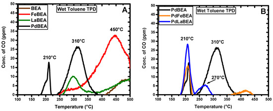 Temperature-programmed desorption of toluene at wet conditions where the concentration of formed CO is plotted against the corresponding temperature for (A) BEA, Fe/BEA, La/BEA, and Pd/BEA; and (B) Pd/BEA, Pd/Fe/BEA, and Pd/La/BEA.
