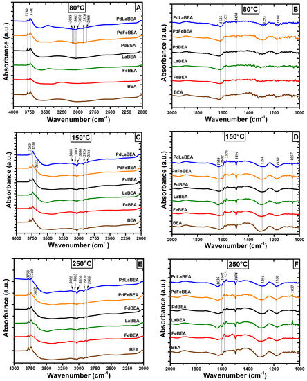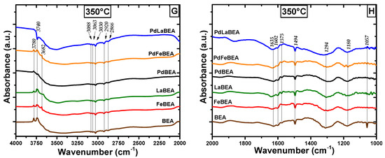 Already at 80 °C, we can observe positive absorption bands at 3780 and 3740 cm−1, which are associated to hydroxyl groups. The peak located at 3740 cm−1 has previously been assigned to the O-H stretching of Si-OH groups, which has been observed for zeolite ZSM-5 [23]. Thus, the DRIFTS results suggest that some of the water species (2300–3600 cm−1) are transformed to hydroxyl groups (at 3780 and 3740 cm−1). Moreover, two peaks located around 1575 cm−1 can also be observed. These peaks appear to be similar for all samples, except for Fe/BEA and BEA, and are the strongest in the temperature range 200–250 °C. The main desorption of toluene had already occurred in this temperature range and the desorption occurred in the range where the desorption of ethene was observed in the samples in the toluene-TPD experiments (see Figure 6). It is, therefore, possible that these peaks are associated with cracking of toluene into smaller-sized hydrocarbon chains, which desorb. Given that pure zeolite beta and Fe/BEA do not provide any more absorption peaks in the region around 1575 cm−1, while the other samples do, this may suggest that Pd and La provide the system with additional HC storage sites.