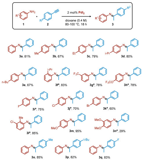 Once the best reaction conditions (Table 1, entry 6) were determined, we then investigated the scope for variously substituted anilines (1) and arylacetylenes (2) (Scheme 1). In general, the yields attained using PdI2 as catalyst were comparable with the ones achieved with the previously employed more complex catalytic systems [30]. For example, different alkyl chains at the para position of the aniline provided good yields, irrespective of the length of the chain (yields of 3b, 67%; 3c, 79%; 3e, 67%) or the steric hindrance (3d, 80%). Interestingly, an isopropyl group at the ortho position of the aniline also allowed an excellent product yield (3f, 83%). Fluoro-containing groups were well tolerated under these reaction conditions, regardless of their position or electronic properties. With a CF3 group at the meta position, the expected imine 3g was formed in 78% yield, and the same result was observed starting from the aniline ring bearing an OCF3 substituent para to the NH2 group (3h, 78%). para-Substituted anilines with fluoro, chloro, or bromo smoothly underwent the hydroamination, resulting in 75% (3i), 70% (3j), and 60% (3k) yields of the desired imines, respectively. Even a disubstituted aniline, such as 2-methyl-3-chloroaniline, behaved nicely, providing the corresponding product 3l with 85% yield. The OMe substituent in para position on the aniline ring led to 95% yield of 3m, while the presence of two OMe groups caused a significant decrease of the yield (3n, 29%).
