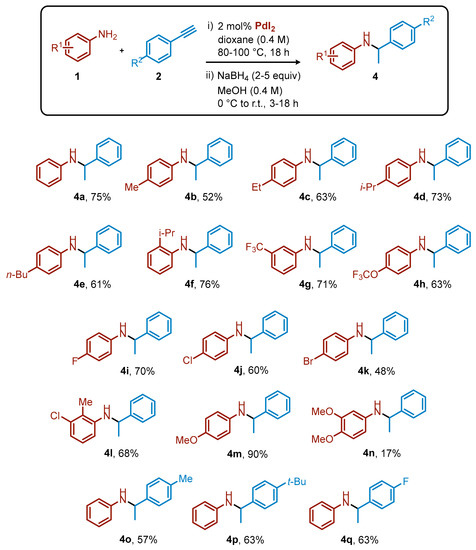 Not surprisingly, imine products 3 were unstable under acidic conditions and the isolated yields after column chromatography were very low. We then decided to reduce compounds 3 to the corresponding, more stable secondary amines 4 (See Supplementary Materials for NMR spectra of 4), using simple and inexpensive NaBH4. The overall isolated yields for the two-step synthesis of secondary amines 4 (I step: PdI2-catalyzed hydroamination and II step: reduction) starting from anilines and terminal arylacetylenes, reported in Scheme 3, ranged from 17% to 90%. In some cases, the two-step yield was about 20% lower than the corresponding NMR hydroamination yield (4o-q). This was mainly due to a non-optimized reduction procedure, which can be improved with the use of alternative reduction reagents, such as NaBH3CN.