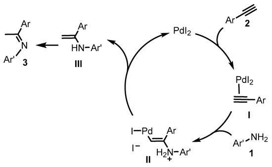Proposed mechanism for PdI2-catalyzed hydroamination of terminal alkynes 2 with anilines 1 leading to imines 3 through the formation of vinylamines III as intermediates.