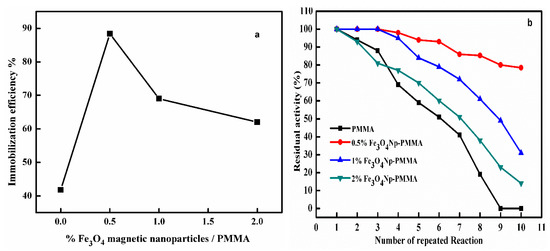 Nanoparticles provide important remedies for contradictory issues, such as the highest surface area per unit of weight, high enzyme loading, and minimal diffusion limitations, which are usually encountered during enzyme adsorption optimization. Besides the enhanced performance characteristics, the important behaviors of the nanoparticles also highlighted the interesting transition region between homogeneous and heterogeneous catalysis [18]. Magnetic nanomaterials were used in protein immobilization in various capacities [16,19]; for example, non-modified magnetic Fe3O4 nanoparticles were physically immobilized on peroxidase, preserving 55% of original activity after being used 10 times [20]. Figure 1 shows a schematic illustration of HRP encapsulation onto a magnetic Fe3O4Np–PMMA film via casting. Figure 2a shows the effect of nanoparticle concentration on the efficiency of the immobilization. The highest immobilization efficiency (88%) was detected with the 0.5% magnetic Fe3O4Np film. Immobilization efficiency was improved by increasing the proportion of Fe3O4Np to around 0.5% and then decreasing. Jun et al. [21] and Mohamed et al. [22] reported that the peroxidase was immobilized on modified multi-walled carbon nanotubes and amidoximated acrylic polymer with an immobilization efficiency of 81.74% and 70%, respectively. The loss of immobilized-HRP activity when the magnetic Fe3O4Np concentration was increased was attributed to the multiple attachments points of the enzyme to the polymer film [23]. An important benefit of immobilization is that enzyme are easy to reuse. Immobilized HRP enzyme was reused 10 times with the residual activity reducing with repeated use. As Figure 2b shows, the immobilized enzyme on the 0.5% Fe3O4Np–PMMA film retained 78.5% of its original activity after 10 uses, while the immobilized enzymes on the 1% and 2% Fe3O4Np–PMMA films retained 31% and 14% of the initial activity, respectively, after being reused 10 times. Moreover, immobilized HRP on free PMMA was completely inhibited after 10 cycles. This decreased activity was caused by the inactivation of the enzyme, which was induced by protein denaturation and high substrate concentrations [24]. Zhang and Cat [25] and Yu et al. [26] demonstrated that the HRP immobilization on Fe3O4/nanotubes composites and amino-functionalized bacterial cellulose retained 65% and 70% of the original activity after 6 and 10 times, respectively.