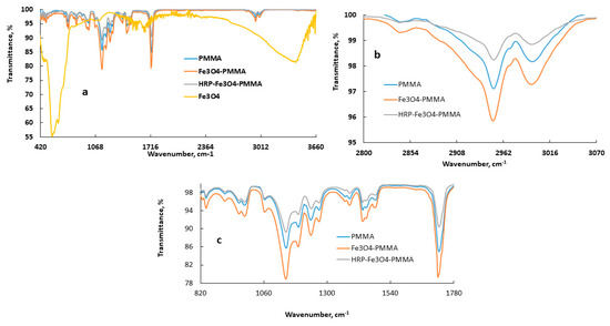 ATR-FTIR spectra of iron magnetic nanoparticles (Fe3O4), polymethyl methacrylate (PMMA), iron magnetic nanoparticles with polymethyl methacrylate (Fe3O4-PMMA) and horseradish peroxidase encapsulated onto iron magnetic nanoparticles with polymethyl methacrylate (HRP-Fe3O4Np-PMMA) samples (a) (full scale), and ATR-FTIR of expanded regions for PMMA, Fe3O4-PMMA and HRP-Fe3O4-PMMA (b,c).