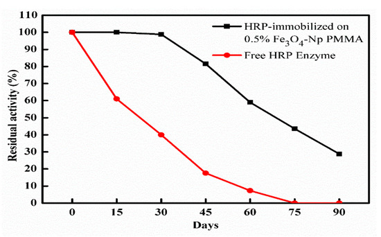 The influence of metals on the free and immobilized–HRP on a 0.5% Fe3O4Np–PMMA film was evaluated (Table 3). Fe3+ demonstrated high activation in the immobilized HRP relative to the free HRP. Cu2+ also showed similarly high activation effects for the immobilized HRP but had a small inhibitory effect on the free HRP. All of the metal ions studied displayed a moderate inhibitive effect on immobilized HRP compared to free HRP, with the exceptions of Hg2+, Cd2+, and Pb2+, which showed significant inhibitory effects on free HRP. Zn2+ had a strong inhibitory effect on immobilized HRP, but overall inhibited free HRP activity. Therefore, HRP immobilized on an Fe3O4Np–PMMA film was shown to be more resistant than the free form to 5 mM metal ions. The stability of the HRP immobilized on an Fe3O4Np–PMMA film against many metal ions demonstrated that such an enzyme could be used even in the presence of heavy metals to treat aromatic pollutants; similar results were reported by Mohamed et al. and Lobarzewski et al. [20,38].