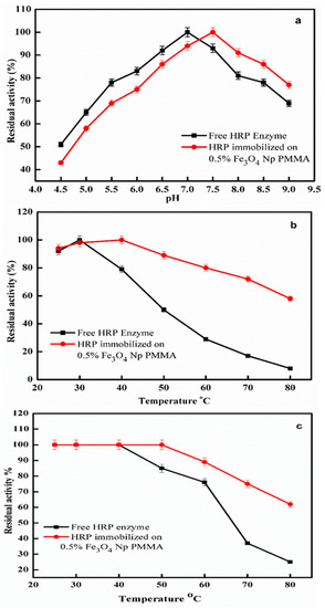 The optimal pH values of the immobilized and free HRP forms in the pH range of 4.5–9.0 were evaluated (Figure 7a). The results indicated that the optimum pH value of the immobilized HRP on 0.5% the Fe3O4Np–PMMA film shifted to 7.5. Similar results were reported for immobilized HRP on non-modified Fe3O4 magnetic nanoparticles [20]. Contrarily, HRP immobilized on activated wool showed a broad optimum pH of 7.0–8.0 [32]. The pH moved toward an alkaline value after immobilization, which may have been due to secondary interactions between the enzymes and polymeric matrices [33,34]. Figure 7b shows the effect of changes in temperature on the activity levels of the immobilized and free HRP forms. The optimum temperature of the free enzyme was 30 °C, which shifted to 40 °C for the immobilized enzyme; significantly higher enzyme activity was preserved for the immobilized enzyme at all temperatures between 25 and 80 °C. Similar results were reported for soluble and immobilized peroxidase [32]. The increase in optimal temperature showed that immobilized HRP was resistant to a rise in temperature. The modified physicochemical properties of the enzyme induced the change in the optimum temperature. The thermal stability of the free HRP was 40 °C but, after immobilization, a difference in thermal stability was observed; the immobilized HRP was thermally stable up to 50 °C and retained 62% of its activity at 80 °C, while the free HRP enzyme retained only 25% of its activity at the same temperature (Figure 7c). Similar results were reported for non-modified iron–HRP (50 °C) [20], activated wool–horseradish peroxidase (40 °C) [32], and modified chitosan–HRP (45 °C) [35]. The loss in activity (>80 °C) was probably due to the denaturation of some enzyme components, the degradation of a polymer matrix, and enzyme leaching from the swollen polymer matrix [36]. The thermal stability of the enzymes was found to dramatically increase when bound to the complementary surface of a fairly stable structure in a multipoint manner [37].