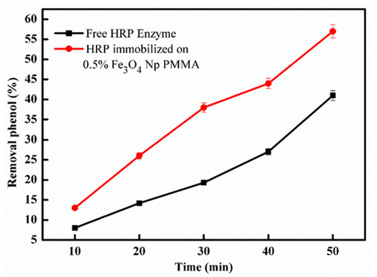 Enzyme re-usage and the effects of some compounds on the immobilized HRP by encapsulation onto an Fe3O4Np–PMMA film were compared with HRP–immobilized on non-modified Fe3O4Np, which was recently published [20]. Table 5 shows that HRP immobilized by encapsulation onto an Fe3O4Np–PMMA film was able to be reused 10 times, in comparison to 5 times for HRP immobilized on non-modified Fe3O4Np. The two kinds of immobilized enzymes showed high resistance against metals. HRP–immobilized on the Fe3O4Np–PMMA film exhibited higher affinity for the substrate compared with HRP–immobilized on non-modified Fe3O4Np. HRP immobilized on Fe3O4Np–PMMA film showed more resistance to Triton X-100, urea and isopropanol compared with HRP–immobilized on non-modified Fe3O4Np. Phenolic compounds are considered to be a major pollutant in industrial wastewaters, therefore, immobilized and free–HRP were used as catalysts to activate H2O2 to degrade phenol. As shown in Figure 8, after 50 min of incubation, the immobilized–HRP showed higher efficiency regarding the removal of phenol than the free HRP. Similar findings were reported in previous works [22,44].