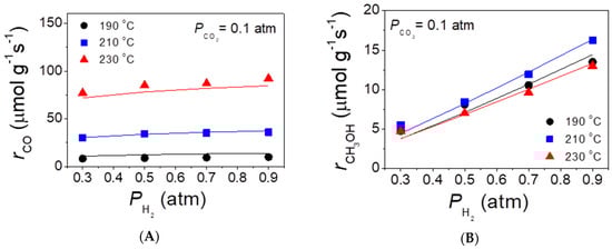 Effects of the partial pressure of H2 in the feed at the constant partial pressure of CO2 (A,B) and of the partial pressure of CO2 at constant partial pressure of H2 (C,D) on the rates of CO (A,C) and methanol (B,D) evolution at temperatures of 190, 210, and 230 °C. Solid lines correspond to fitting of experimental results (symbols) with the use of the kinetic model described in Section 3.2.