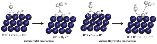 HER usually occurs on the catalyst surface in one of two different steps and can follow the Volmer–Tafel mechanism or Volmer–Heyrovsky mechanism [11,30,31]. In acidic solutions, the two-electron transfer reaction that occurs on the catalyst surface by two steps is shown in Figure 1 [10]. The first step of HER is called Volmer or the discharge reaction, which discharges protons (H+) through coupling with an electron on the active surface of the catalyst to form adsorbed hydrogen intermediates (Hads) [32]. The source of protons depends on the pH of the electrolyte. In acidic solutions, it is the hydrogen cation in the electrolyte, while, in alkaline electrolyte, it is the water molecule. In the second step, the formation of the hydrogen molecule in both acidic and basic electrolytes may occur through two different reaction mechanisms, depending on the Hads coverage on the catalyst surface [33]. If the Hads coverage on the surface is large, two adjacent Hads on the electrode surface will recombine with each other to generate a hydrogen molecule, which is called a combination or Volmer-Tafel reaction [34]. If the Hads coverage on the surface is low, the single Hads would prefer to combine with H+ from the solution and an electron simultaneously to form a hydrogen molecule, which is called the atom + ion or the Volmer-Heyrovsky reaction [35]. For the binding strength of the reaction intermediates, the inherent catalytic activity of the HER catalyst is closely related with the H-adsorption Gibbs free energy (ΔGH*) where * represents the active site on the surface of the catalyst [32]. The ΔGH* can be a good descriptor for determining the HER rate. If the ΔGH* is negative for the catalyst, the H* will bind better to the surface of the electrode and make the Volmer step (initial step) take place very easily. If a catalyst has a large |ΔGH*| value, the Heyrovsky or Tafel step will be difficult and eventually the entire reaction will become slow. Therefore, the active catalyst for HER needs to have a ΔGH* near zero. It is well-known that the mechanism is distinguished by the Tafel slopes measured during the HER process. If the Volmer reaction (discharge reaction) is fast and the hydrogen molecules are generated by the rate determining combination (Tafel) reaction, the corresponding Tafel slope is 29 mV/dec. If the discharge reaction is fast and the hydrogen molecules are produced by a rate determining atom + ion (Heyrovsky) reaction, the corresponding Tafel slope is 38 mV/dec. If the discharging of H+ is slow, the hydrogen is evolved either by a rate determining atom + ion reaction or a combination reaction. The corresponding Tafel slope is 116 mV/dec [32].