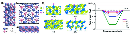 It is well-known that MoS2 shows high catalytic activities toward both HER and hydrodesulfurization (HDS) [36,37]. Both HDS and HER rely on the catalyst to reversibly combine hydrogen and hydrogen dissociates to produce H2S in HDS with protons bound to the catalyst to promote the formation of hydrogen in HER [38,39]. These commonalities between the mechanisms and putative active sites of MoS2 for both HDS and HER catalysis suggest that other materials used for catalytic HDS may also be active electrocatalysts for HER. Typically, Figure 2a shows the crystal structure of the nickel phosphide (Ni2P), which possesses a hexagonal structure [40], and it has been demonstrated that nickel phosphide (Ni2P) shows excellent catalytic performance toward HDS [41] and water gas shift reactions for the production of hydrogen [42,43,44]. Therefore, it can be speculated that nickel phosphide has electrocatalytic activities toward HER. Nickel phosphides show high physicochemical stability and a superior anticorrosion feature, especially in the acidic electrolyte, which are very important for the applications in the electrolyzers.