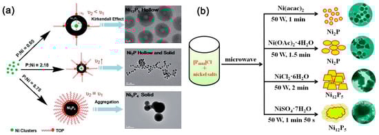 Possible formation mechanism of the as-synthesized nickel phosphide NCs with different phases and morphologies (a). Reproduced with permission from Reference [50], Copyright, The Royal Society of Chemistry, 2015. Typical schematic illustration for synthesizing various nickel phosphides controlled by the counter anions of nickel salts (b). Reproduced with permission from Reference [56], Copyright, the American Chemical Society, 2018.