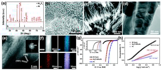 Nickel phosphide nanoparticles with different Ni/P ratios can be synthesized by solution-phase reactions, which usually need polymer binders like Nafion to adhere catalysts to the electrodes for HER. Polymer binders generally increase electrical resistance and may reduce active sites, which results in reduced effective catalytic activity and affects long-term stability. Therefore, efforts are devoted to developing approaches for directly growing nickel phosphides on conductive substrates through solution-phase reactions. Wang et al. reported an easy one-step route for the fabrication of an integrated nickel phosphide nanorods/nickel (Ni2P-NRs/Ni) electrode by direct phosphidation of a commercially available Ni foam current collector under solvothermal conditions using red phosphorus (P) as the precursor [57]. The XRD pattern of the solvothermally-derived product in Figure 5a can be indexed as a hexagonal Ni2P phase with little admixture of a tetragonal Ni-rich Ni12P5 phase and un-reacted Ni foam underneath. The SEM image in Figure 5b clearly shows the morphology of the nickel phosphides on Ni foam. Densely and vertically arranged NR arrays have formed on the entire surface of the nickel foam ligament. Figure 5c,d are typical dark- and bright-field TEM micrographs, which unambiguously confirm the rod-like shape of the grown Ni2P. The HRTEM image in Figure 5e shows that the measured inter-planar spacings of 0.28 and 0.25 nm correspond to the distance of (101) and (200) crystal planes of hexagonal Ni2P, respectively. Corresponding EDX elemental mapping images in Figure 5f further indicate that both Ni and P elements are uniformly distributed on the as-prepared electrode. According to the data in polarization curves (Figure 5g) and Tafel plots (Figure 5h), when used as an integrated cathode in acidic medium, the as-fabricated Ni2P-NRs/Ni electrode exhibits remarkable electrocatalytic activity toward HER with a small overpotential of 131 mV to attain the current density of 10 mA/cm2 and a Tafel slope of 106.1 mV/dec. Furthermore, the electrode also shows reasonably good long-term stability. The novel fabrication method reported is scalable and can be extended to obtain other integrated transition metal phosphide/transition metal electrodes, and, therefore, represents an important development toward water electrolyzer cathode materials. Yu et al. fabricated a 3D carbon-coated nickel phosphide nanosheets array on the surface of Ni foam via a simple one-step solvothermal procedure with red phosphorus as the P source [58]. The as-prepared C@Ni8P3 exhibits excellent HER activity and extraordinary duration in both acidic and basic media. Shi et al. demonstrated the growth of Ni2P nanosheets on Ni foam by using a low concentration of TOP as a P source [59]. The Ni2P/Ni, acting as a robust 3D self-supported super-aerophobic hydrogen-evolving cathode, shows superior catalytic performance, stability, and durability in aqueous media over a wide pH value of 0−14. Lai et al. successfully synthesized a rice-shape nanocrystalline Ni5P4 on Ni foam by a simple one-step hydrothermal process with sodium hypophosphite as the P source [46]. The Ni5P4/NF showed excellent HER performance with a low overpotential of 64 mV at a current density of 10 mA/cm2 and a small Tafel slope of 64 mV/dec. Some other studies on the preparation of nickel phosphide nanostructures with various morphologies have also been reported through a one-step hydrothermal method with different phosphorus compounds as the P source (e.g., TOP, sodium hypophosphite, and red phosphorus). All the morphologies, precursors, and corresponding HER performance in acidic or alkaline electrolyte are summarized in Table 1 (acidic) and Table 2 (alkaline) for comparison. Based on the above results, it can be easily found that the solution-phase method generally produces nickel phosphide nanoparticles with different compositions or crystal phases, which can act as model catalysts to study and compare the HER performance between different compositions, crystal phases, or facets and are useful to make catalyst inks for practical applications in membrane electrodes. However, it is difficult to control the morphologies of the nickel phosphides and some of the precursors are high cost for practical use.
