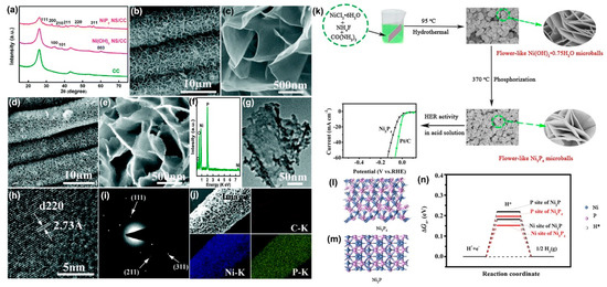Although the solution-phase methods could produce nickel phosphide nanoparticles or nanocrystals with efficient HER activities, it requires effective immobilization of these catalysts on conductive support electrodes using a polymer binder such as Nafion or polytetrafluoroethylene (PTFE) for practical use. These polymer binders generally increase series resistance and may block active sites and inhibit diffusion, which leads to reduced catalytic HER activity. As a result, it is of significant importance to develop a binder-free HER cathode by directly growing the active nickel phosphide catalysts on current collectors. Jiang et al. reported a two-step strategy toward this direction to construct P-rich NiP2 nanosheet arrays supported on carbon cloth (NiP2 NS/CC), which involved the first step to grow Ni(OH)2 nanosheet arrays on CC (Ni(OH)2 NS/CC) hydrothermally followed by converting into NiP2 NS/CC by a low-temperature phosphidation reaction with hypophosphite [76]. The X-ray diffraction (XRD) pattern in Figure 6a clearly indicates the crystal phase of Ni2P. The SEM images of Ni(OH)2 NS/CC in Figure 6b,c and NiP2 NS/CC in Figure 6d,e indicate that the Ni(OH)2 nanosheet precursor on carbon cloth can be converted into NiP2 NS/CC while the structures and morphologies remain unchanged. The corresponding energy dispersive X-ray (EDX) spectrum in Figure 6f shows the atomic ratio between Ni and P to be close to 1:2. The TEM (Figure 6g), HRTEM (Figure 6h), and selected-area electron diffraction (SAED) (Figure 6i) images further confirmed the morphology and crystal phase of the NiP2 nanosheet. The corresponding EDX elemental mapping images in Figure 6j further indicate that both Ni and P elements are uniformly distributed in the whole NiP2 nanosheet arrays. The NiP2 NS/CC electrode exhibits high catalytic performance in acidic solutions with overpotentials of 75 and 204 mV to afford current densities of 10 and 100 mA/cm2, respectively, a Tafel slope of 51 mV/dec, an exchange current density of 0.26 mA/cm2, and nearly 100% Faradaic efficiency. Similarly, Cao et al. reported the synthesis of a hollow Ni2P microsphere structure via a facile two-step process, including hydrothermal synthesis of Ni(OH)2 followed by phosphidation with NaH2PO2 under argon [77]. Wang et al. successfully synthesized flower-like nickel phosphide microballs (Ni5P4-MBs) on the surface of a Ti foil substrate by a facile hydrothermal preparation of precursors followed by a post-phosphidation process with hypophosphite (Figure 6k). All possible Ni and P active sites of nickel phosphide were investigated by DFT simulation at a different hydrogen coverage (Figure 6l,m,n). According to the DFT calculation results, the P site of Ni5P4 and NiP2 had an endothermic ΔGH* of 0.196 and 0.219 eV, respectively, which implies an energetically unfavorable interaction with hydrogen. Therefore, the Ni site of Ni5P4 is the main catalytically active site for the HER. The flower-like Ni5P4 microballs electrocatalyst exhibits excellent activity for the HER with a low overpotential of 35.4 mV to reach a current density of 10 mA/cm2 and a small Tafel slope of 48 mV/dec in acidic solution. By employing a similar strategy, various structures and morphologies of nickel-containing precursors have been prepared through hydrothermal methods, and then are chemically converted into nickel phosphide electrocatalysts by a low-temperature phosphidation reaction using hypophosphite as a P source. The structures and morphologies and corresponding electrocatalytic HER performances in acidic or alkaline electrolyte are summarized in Table 3 and Table 4, respectively.
