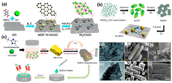Schematic illustration of the synthesis procedure for the Ni2P/rGO (a), high magnification SEM (d), and TEM (e) images of the Ni2P/rGO. Reproduced with permission from Reference [106], Copyright the Royal Society of Chemistry, 2018. Schematic representation for the simple synthesis of Ni@GC and Ni2P@GC materials (b), SEM image of the Ni-BTC precursors (h), and SEM image of the Ni@GC samples (i). Reproduced with permission from Reference [93], Copyright Elsevier B.V., 2019. Schematic illustration of the preparation process of the Ni2P@C catalyst and its application as an electrocatalyst for HER (c). Reproduced with permission from Reference [82], Copyright Elsevier B.V., 2018. SEM images of MOF-74-Ni (f) and Ni2P/C (g). Reproduced with permission from Reference [91], Copyright Elsevier B.V., 2018.