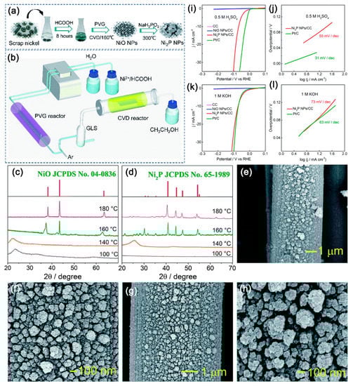 In addition, in spite of that transition, metal nickel has a high abundance and much lower cost as a source for preparation of nickel phosphide electrocatalysts for large-scale hydrogen production through electrochemical water splitting. It may be a more environmentally-friendly and cost-effective way if Ni waste and scrap can be recovered for preparing nickel phosphide electrocatalysts. However, it remains a challenge because of their large amounts of impurities. Recently, Zheng et al. proposed a simple method to synthesize 3D Ni2P nanoparticles from scrap nickel on carbon cloth (Ni2P NPs/CC) [110]. As shown in Figure 8a,b, they first dissolved nickel waste in formic acid solution by a simple ultrasonic method. Then NiO nanoparticles were fabricated by photochemical vapor generation and CVD. Lastly, the target product of Ni2P nanoparticles (NPs) was obtained by phosphidation at a low temperature with hypophosphite. The XRD patterns of NiO NPs (Figure 8c) and Ni2P NPs/CC (Figure 8d) at different temperatures demonstrated the formation of each crystal phase. It is intriguing that the NiO NPs consist of relatively regular nanoparticles that are 200–300 nm in size (Figure 8e,f). After phosphidation, the surface is composed of relatively loose nanoparticles with a coral-like morphology, as shown in Figure 8g,h. The polarization curves in Figure 8i,k and Tafel plots in Figure 8j,l, respectively, suggested as-prepared Ni2P NPs possessed significant electrocatalytic performance and excellent stability in both acidic and alkaline media toward the HER with low overpotentials of 69 and 73 mV at 10 mA/cm2 and small Tafel slopes of 55 and 73 mV/dec, respectively. This strategy is simpler, more cost-effective, and more environmentally-friendly when compared to conventional fabrication methods, which shows potentials in the preparation of multi-functional HER electrocatalysts from more abundant elements for efficient utilization of scrap transition metals.
