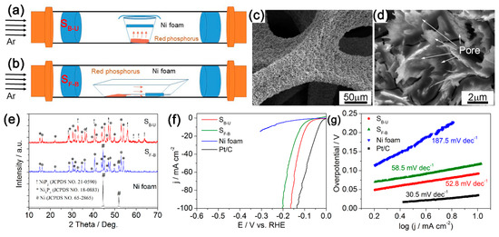 Schematic illustration for preparation of nickel phosphide by the method with bottom-up placement SB-U (a) and an upstream-downstream placement SF-U (b). Low- (c) and high- (d) magnification SEM images of SB-U. XRD patterns of the SB-U (500 °C), SF-B (500 °C), and the pristine Ni foam (e). Polarization curves (f) and Tafel plots (g) of the SB-U (500 °C), SF-B (500 °C), pristine Ni foam, and Pt/C catalyst. Reproduced with permission from Reference [117], Copyright Elsevier B.V., 2019.