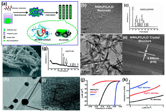 Schematic illustration of the synthetic procedure for the peapod-like Ni2P/C nanocomposites (a), SEM image (b), XRD pattern (c), TEM (d), and HRTEM (e) images of NiNH4PO4·H2O nanorods. SEM image (f), XRD pattern (g), TEM (h), and HRTEM (i) images of Ni2P/C composites. Polarization curves (j) and corresponding Tafel plots (k) for Ni2P and Ni2P/C electrodes in 0.5 M H2SO4. Reproduced with permission from Reference [127], Copyright The Royal Society of Chemistry, 2015.
