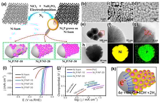Schematic illustration for the electrochemical deposition of hierarchical radial NixP nanospheres on Ni foam (a), SEM images of NixP/NF-10 (b), NixP/NF-20 (c), and NixP/NF-30 (d), TEM image of radial NixP-10 nanospheres (e), the magnified TEM image of a red squared indicated area (f), HRTEM (g), and elemental mapping images of the radial NixP-10 nanospheres (h). iR-corrected LSV curves for NixP/Ni foam, pristine Ni foam, and Pt/C electrodes for HER (i) and corresponding Tafel plots (j), and schematic illustration of the advantages of the brushy surface of NixP/NF-20 for HER (k). Reproduced with permission from Reference [131], Copyright Elsevier B.V., 2018.