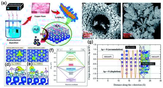 Schematic illustration of the electrochemical synthesis of nickel phosphides on Cu foam (a), SEM images of the Ni5P4 on Cu foam (b,c), top and side view of H* adsorption over the three-fold Ni site of the Ni5P4 (0001)/Cu (111) (site I) (d), and H* over the on-top P site of the Ni5P4 (0001)/Cu (111) surface (site II) (e). The differential ground state charge density distribution around the adsorbate (H*) is at an iso-level of 0.59 × 10−2 eÅ−3. The ΔGH* of the reaction intermediate (H*) on different metal-catalyst surfaces (f) and charge density difference and charge transfer at the interface between Cu (111) and Ni5P4 (001) surface (g). Reproduced with permission from Reference [142], Copyright The Royal Society of Chemistry, 2019.