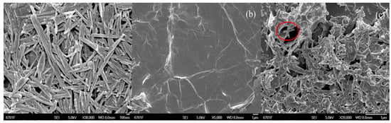 (a) Electron micrograph of attapulgite (ATP); (b) Electron micrograph of graphene oxide (GO); (c) Electron micrograph of Fe2O3/RGO-ATP.
