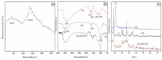 (a) Raman spectrum of Fe2O3/RGO-ATP; (b) FTIR diagrams of ATP, GO, Fe2O3/RGO-ATP; (c) XRD patterns of ATP, GO, Fe2O3/RGO-ATP.
