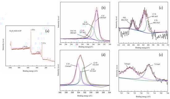 The chemical states of C, O, Fe, and N in Fe2O3/RGO-ATP catalyst were analyzed by XPS, as shown in the overall spectrum in Figure 3a. The C1s spectrum in Figure 3b includes five peaks: the peak at 284.8 eV is attributed to the sp2 bonded carbon (C–C) in graphene, the peak at 287.8 eV originated from the carbonyl group, the peak at 286.1 eV is attributed to the epoxy and hydroxyl (C–O) or C=O, and the peak at 288.4 eV results from the carboxyl group (O–C=O), demonstrating that the oxygen-containing functional groups on the graphene surface were not completely reduced after the high-temperature treatment [,,,]. It can also be attributed to the C=N and C–N bonding configurations, which means that the C–N species are formed in the composite material []. Figure 3c shows the spectrum of N1s with four main peaks: the peak at 401 eV represents the graphitic carbon [,] and the peak at 406 eV represents the nitro group. After long-term high-temperature heating of the ferric nitrate solution, nitrate ions undergo auto-oxidation to produce nitro moieties []. Furthermore, the peak at 400.35 eV represents pyrroleN []. Figure 3d presents the spectrum of O1s with three main peaks: the peak at 532.5 eV indicates C=O on graphene, whereas the peaks at 533.5 eV and 534.0 eV represent C–O [,]. Figure 3e shows the spectrum of Fe2p with two main peaks: the satellite peak of Fe 2p3/2 at 715 eV demonstrates Fe (II) 2p3/2 and the satellite peak of 729 eV represents Fe 2p1/2 [,].