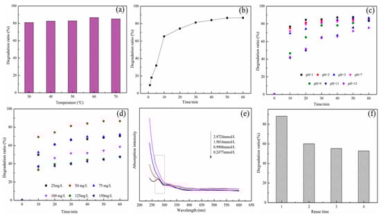 Temperature is one of the important influencing factors for the effective removal of ciprofloxacin by the catalyst. Especially, the temperature is noted to have a significant effect on the catalytic degradation of ciprofloxacin in wastewater in the heterogeneous Fenton reaction system, as shown in Figure 4a. Figure 4a shows that in the reaction temperature range from 30 °C to 70 °C, the degradation ratio of ciprofloxacin increases at first and subsequently decreases. The degradation ratio is noted to be the maximum at 60 °C. The reason for the observed phenomenon is that as the temperature increases, the •OH groups produced by the reaction of H2O2 and iron oxides also increase, thus subsequently increasing the degradation ratio of ciprofloxacin in the heterogeneous reaction. As the temperature reaches 70 °C, it results in an ineffective decomposition of H2O2 into water H2O and O2 [] owing to too high temperature, thus the degradation ratio of ciprofloxacin is reduced. At the same time, the excessively high temperature leads to a waste of reagents. Overall, too high or low temperature is not suitable for the degradation of ciprofloxacin by Fe2O3/RGO-ATP catalyst. Thus, 60 °C was selected as the optimal temperature in subsequent experiments.