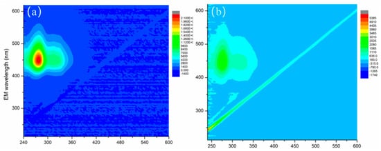 (a) Three-dimensional fluorescence image of ciprofloxacin with concentration of 50 mg/L; (b) Three-dimensional fluorescence image of ciprofloxacin after 60 min degradation by Fe2O3/RGO-ATP/H2O2 system.